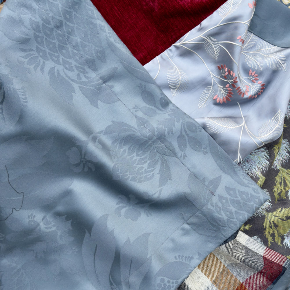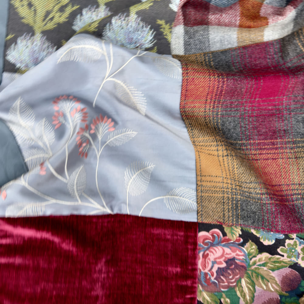 This beautiful throws contains 9 squares of mixed fabrics. Handmade in Edinburgh, Scotland using pure British & Scottish wool and other fabrics. Please contact me if you would like to commission a throw to your specific colour pallet and size.