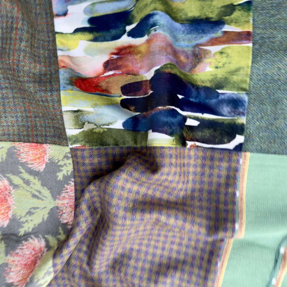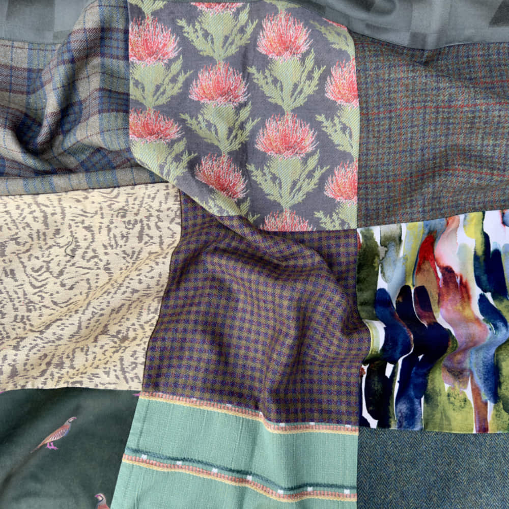 For this throw I have selected pure Scottish tweed with partridge velvet, thistle demask and embroidered Moroccan cotton. Framed and backed with a beautiful soft and pure Scottish wool.