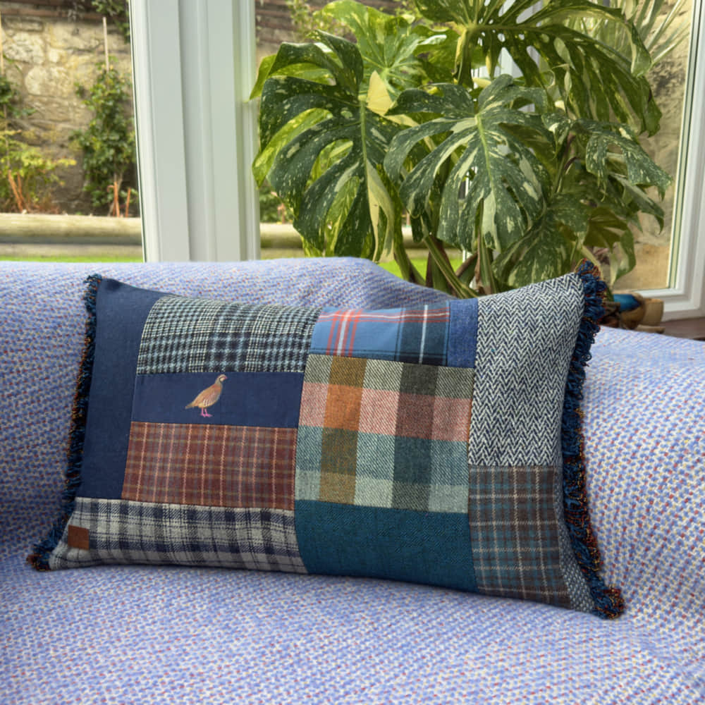 The front of the cushion is pure Scottish and British wools with partridge velvet design