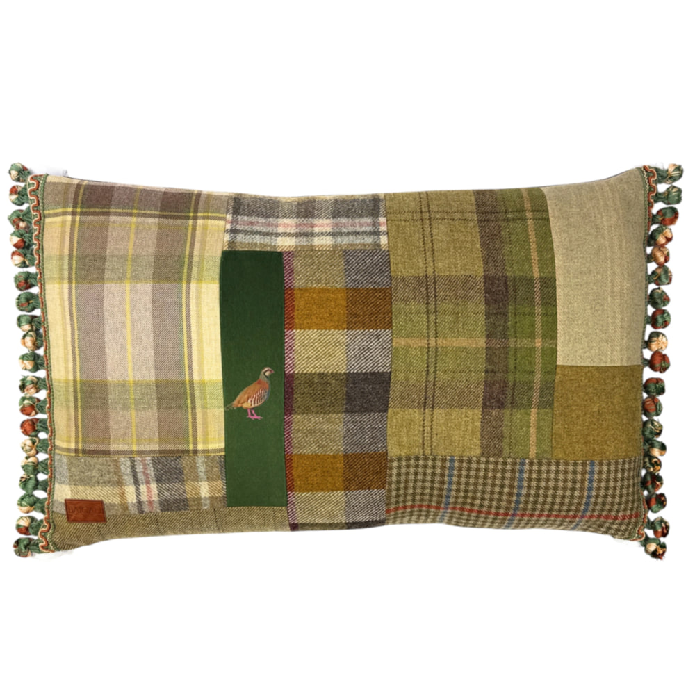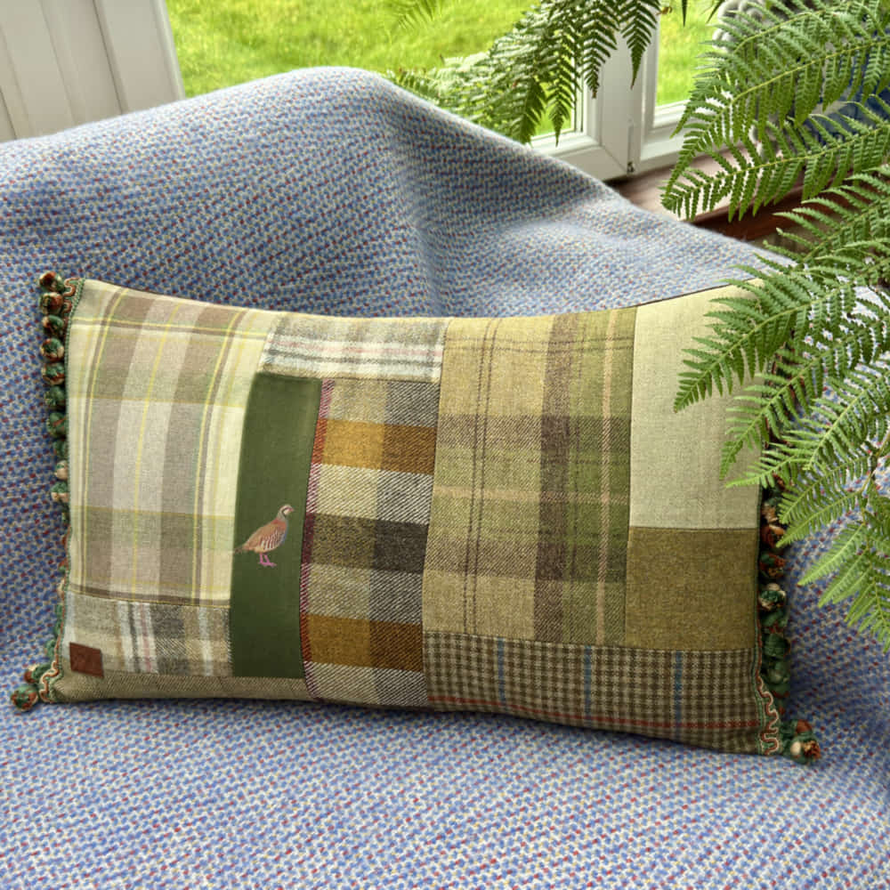 The front of the cushion is pure Scottish and British wools and tweeds with partridge design velvet