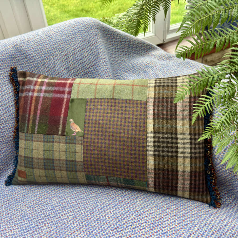 The front of the cushion is pure Scottish and British wools and tweeds with green partridge design velvet