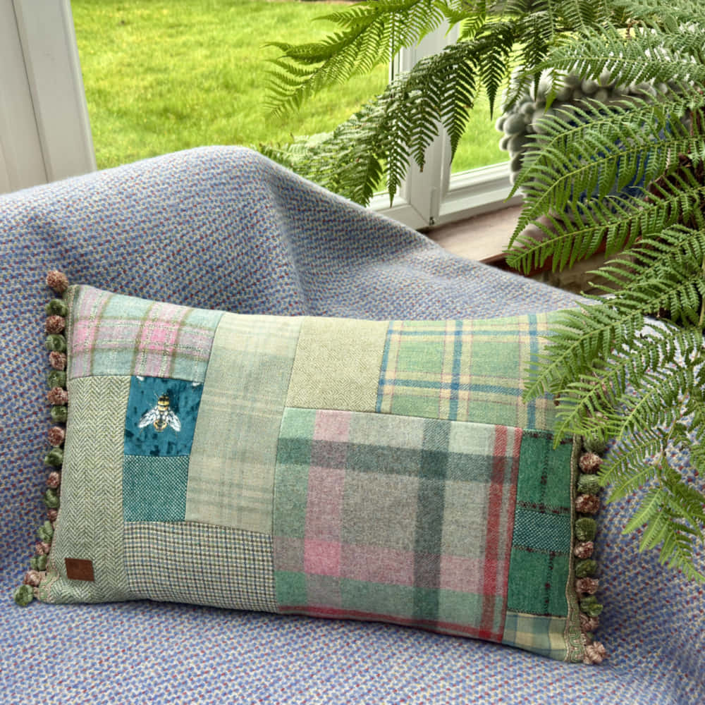 The front of the cushion is pure Scottish and British wools and tweeds with bee design velvet