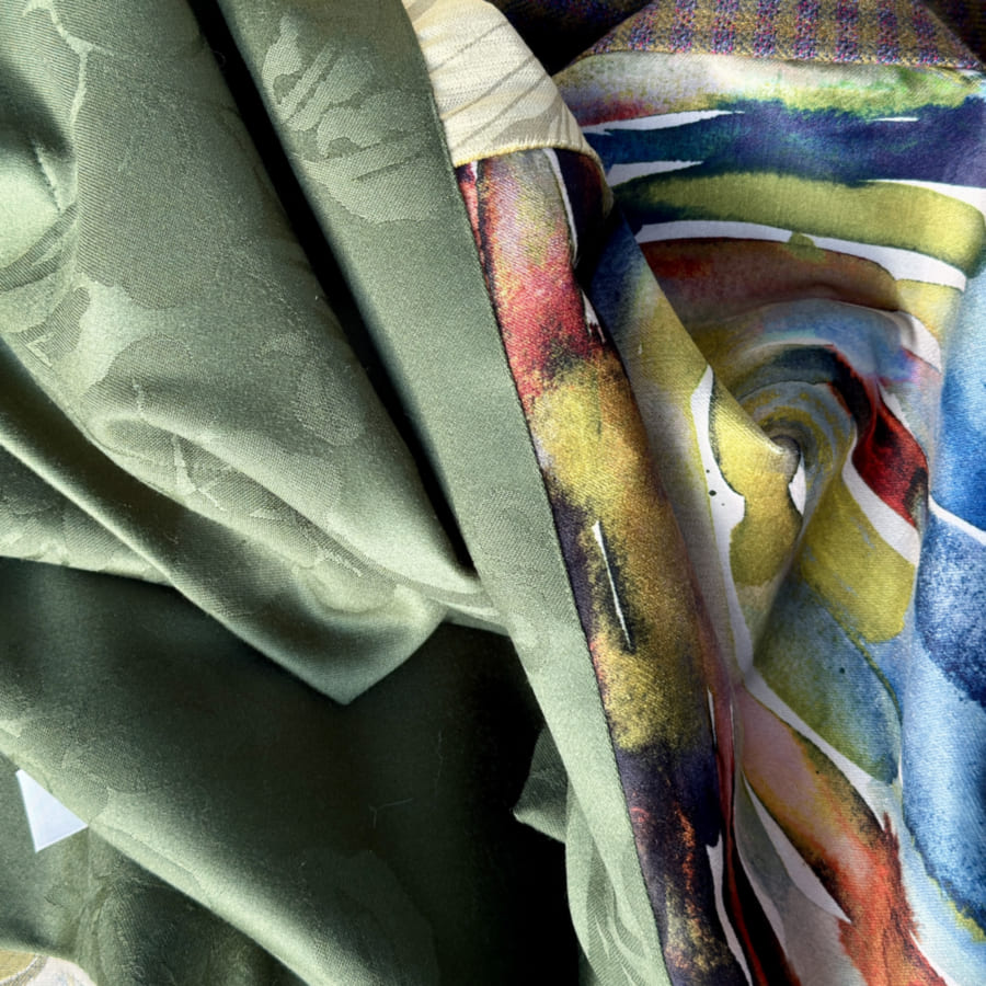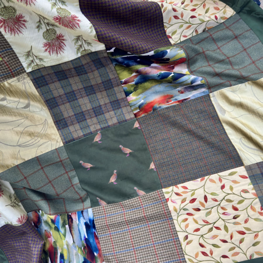 For this throw TL039 I have selected pure Scottish wool, thistle patterns, partridge velvet, plaids and demask fabrics. Framed and backed with a beautiful soft Scottish wool with floral pattern.