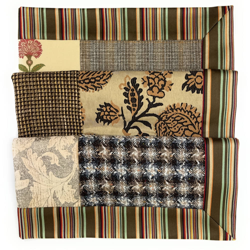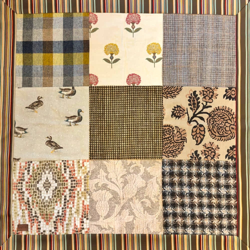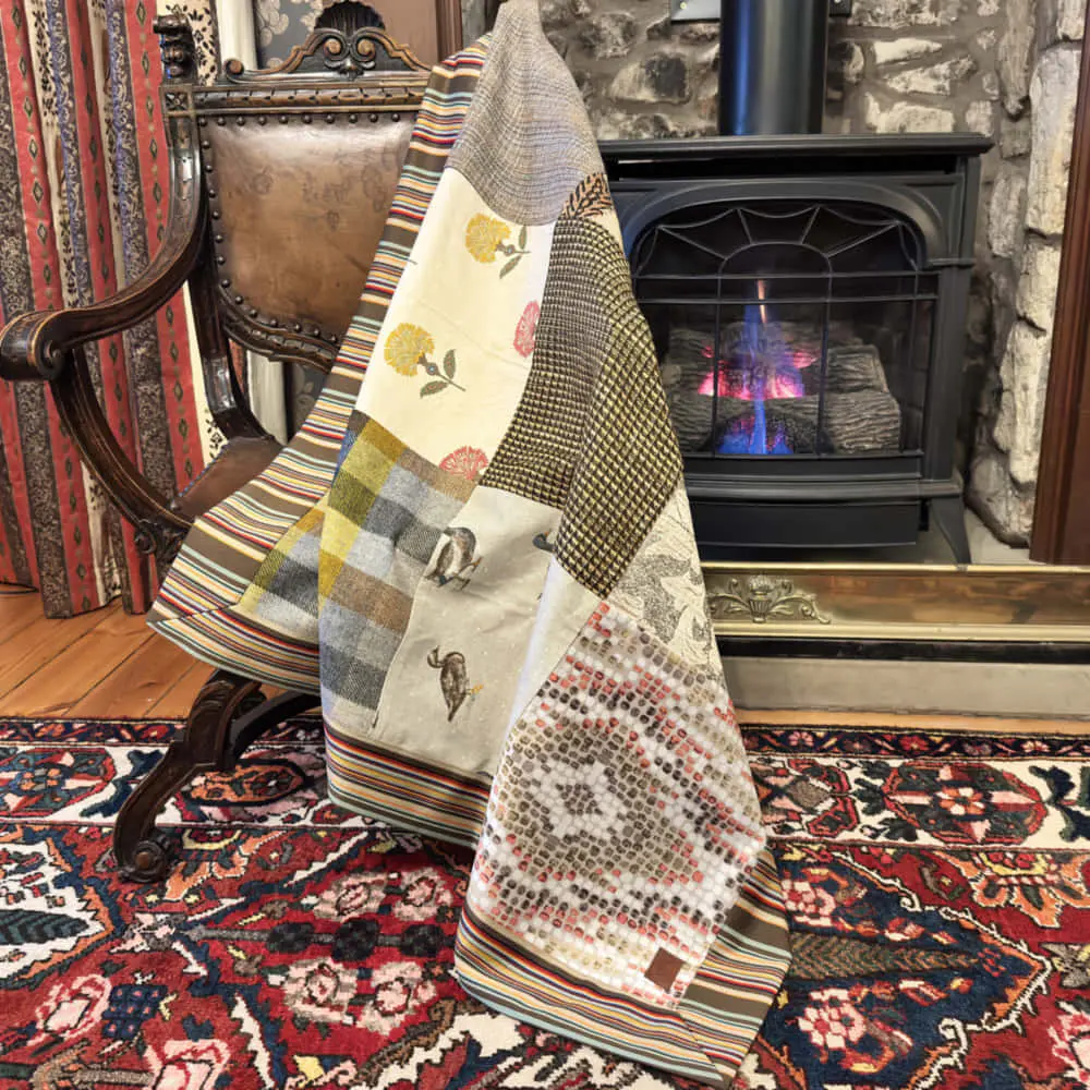 This beautiful throws contains 9 squares of mixed fabrics. Handmade in Edinburgh, Scotland using pure British & Scottish wool and other fabrics. Please contact me if you would like to commission a throw to your specific colour pallet and size.