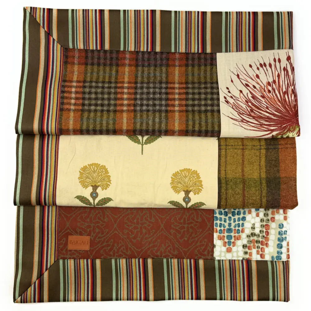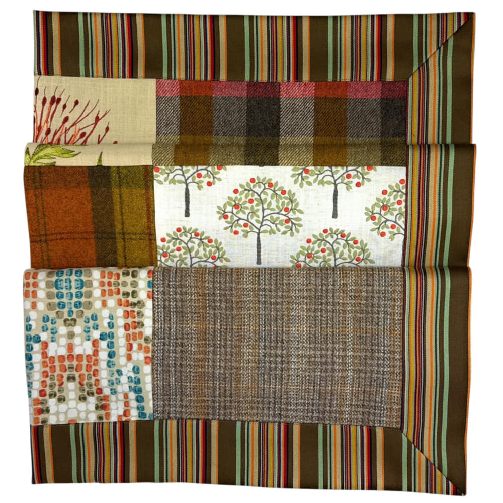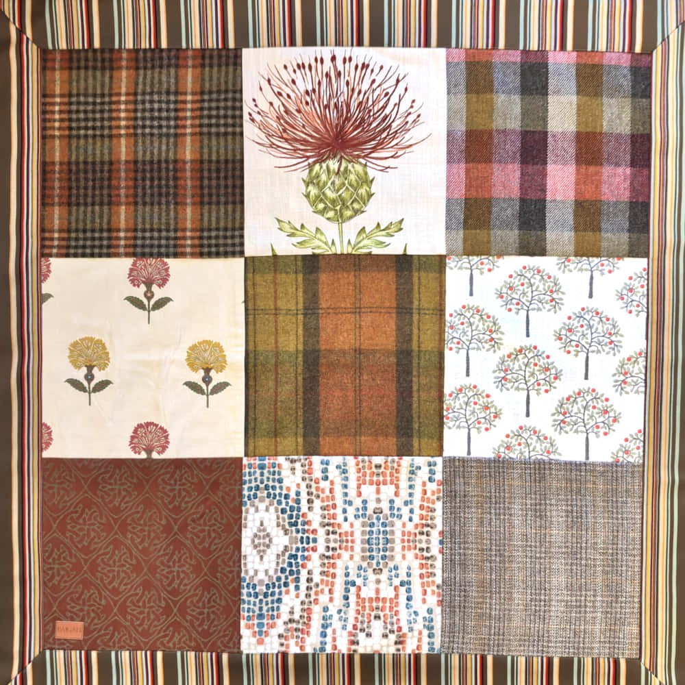 This beautiful throws contains 9 squares of mixed fabrics. Handmade in Edinburgh, Scotland using pure British & Scottish wool and other fabrics. Please contact me if you would like to commission a throw to your specific colour pallet and size.