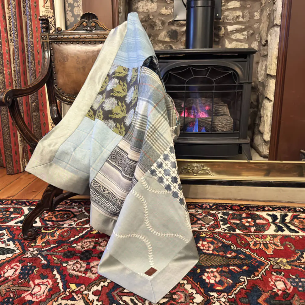 This beautiful throws contains 9 squares of mixed fabrics. Handmade in Edinburgh, Scotland using pure British & Scottish wool and other fabrics. Please contact me if you would like to commission a throw to your specific colour pallet and size.