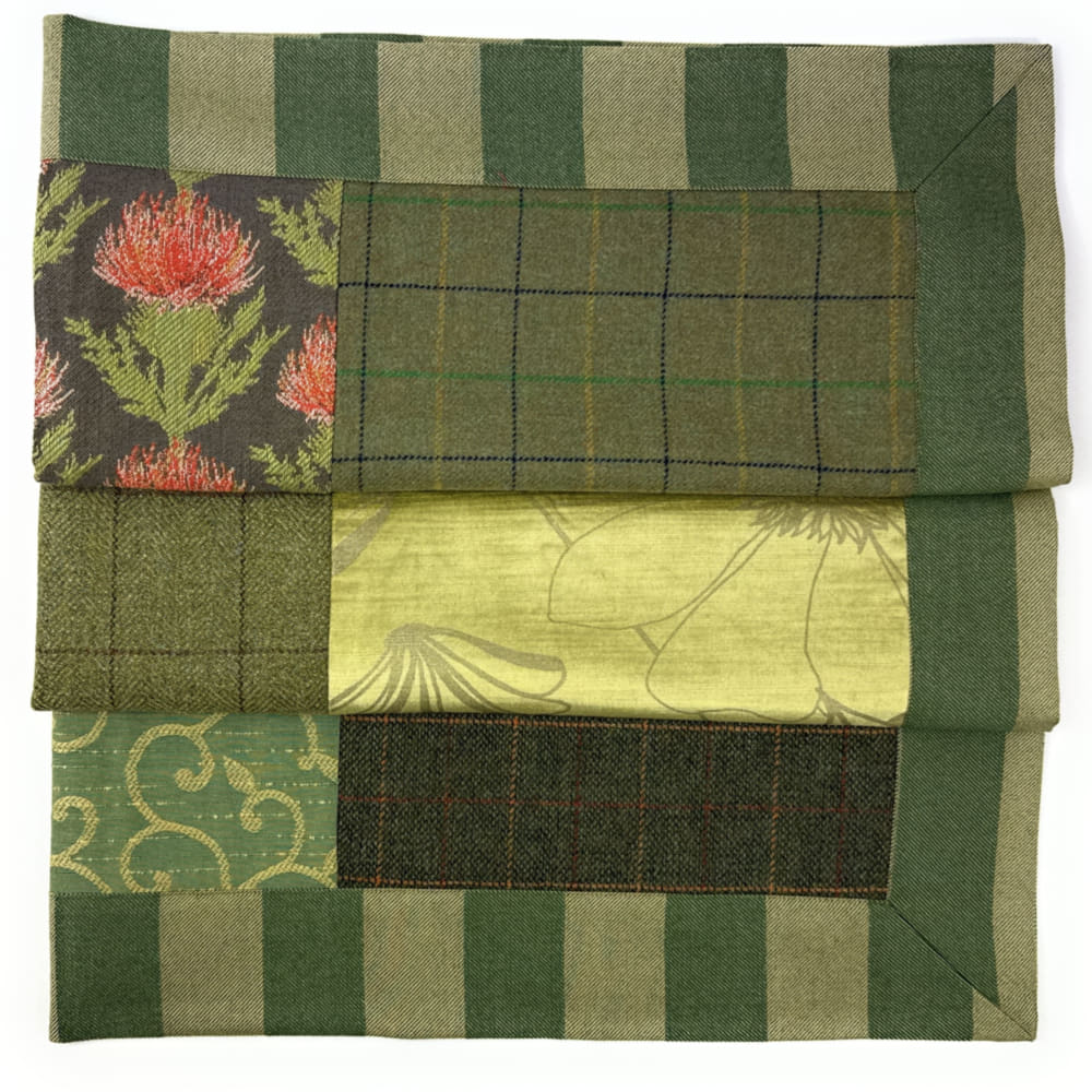 For this throw I have selected pure Scottish tweeds, fine embroidery, partridge velvet and Scottish thistle design. Framed and backed with a beautiful soft and pure Scottish wool with lovely green stripes.