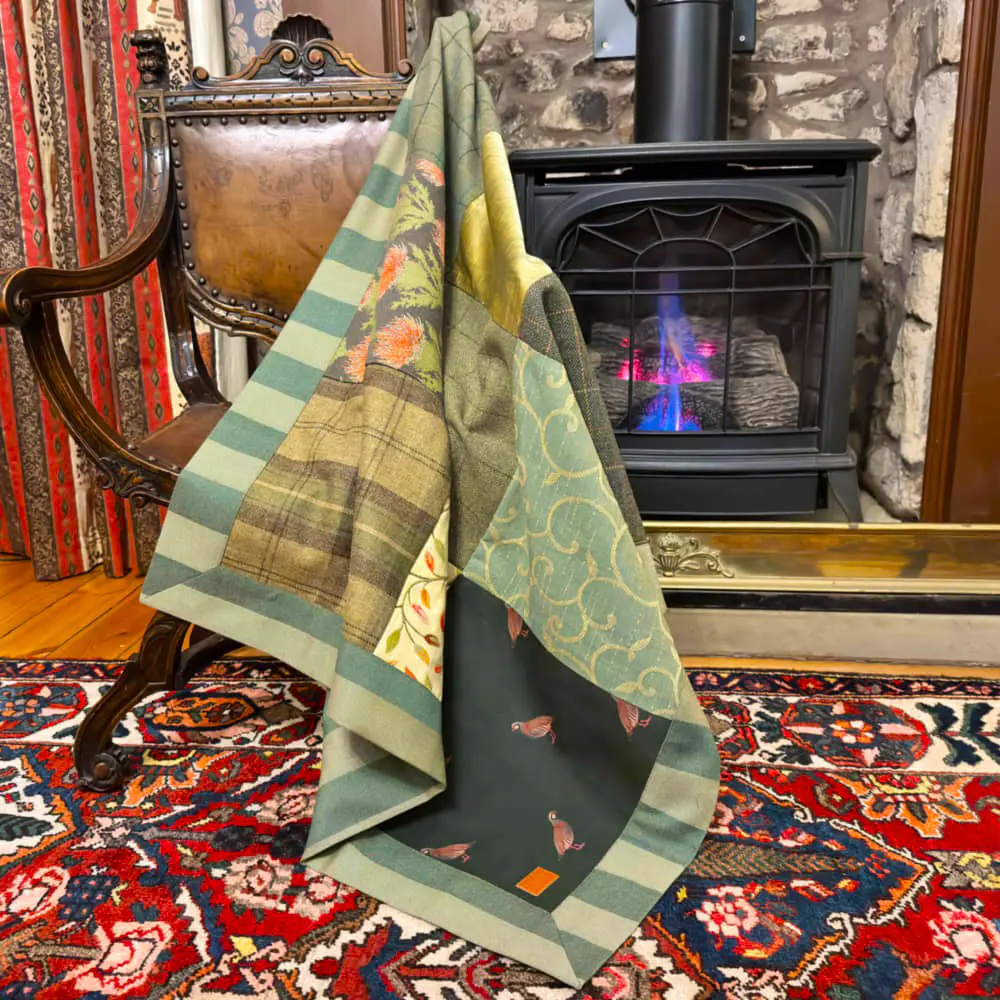 This beautiful throws contains 9 squares of mixed fabrics. Handmade in Edinburgh, Scotland using pure British & Scottish wool and other fabrics. Please contact me if you would like to commission a throw to your specific colour pallet and size.